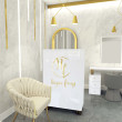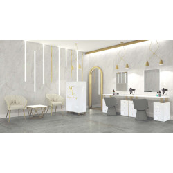 Lada recepcyjna do salonu urody na metalowych nogach to obowiązkowy element w wyposażeniu Twojego gabinetu. Wykonana jest z płyty meblowej w kolorze biały połysk. Złote solidnie wykonane nogi pięknie podkreślą elegancki charakter mebla i sprawią, że lada będzie wygodna w użytkowaniu. Lada sprawdzi się w nowoczesnych wnętrzach w stylu glamour i art deco. W pełni zabudowana od strony Klientki. Wygodna i wysoka lada przy której Klientka wygodnie zapłaci za usługę. Od strony recepcjonistki otwarte półki, na których można przechowywać niezbędne rzeczy, umieścić terminal płatniczy, kasę fiskalną i trzymać kalendarz. Meble z sytemu Klara to najmodniejszy design i gwarancja najwyższej jakości wykonania. W sklepie możliwe do zakupienia również całe wyposażenie gabinetu kosmetycznego tzn. biurka wolnostojące do manicure, toaletki kosmetyczne z oświetleniem LED dla makijażystek, komody do przechowywania, stolik kawowy z krzesłami do poczekalni.