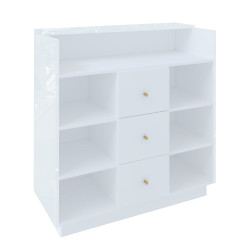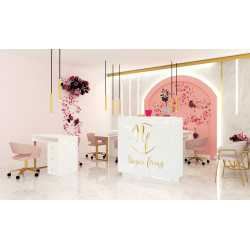 Lada recepcyjna do salonu to obowiązkowy element w wyposażeniu Twojego gabinetu. Wykonana jest z płyty meblowej w kolorze biały połysk. Od strony recepcjonistki wygodne szuflady ze złotymi okrągłymi uchwytami, otwarte półki i duży wygodny blat, gdzie można przechowywać niezbędne rzeczy, umieścić terminal płatniczy, kasę fiskalną i trzymać kalendarz. Lada sprawdzi się w nowoczesnych wnętrzach w stylu glamour i art deco. W pełni zabudowana od strony Klientki. Wygodna i wysoka lada przy której Klientka wygodnie zapłaci za usługę. Meble z sytemu Klara to najmodniejszy design i gwarancja najwyższej jakości wykonania. W sklepie możliwe do zakupienia również całe wyposażenie gabinetu kosmetycznego tzn. biurka wolnostojące do manicure, toaletki kosmetyczne z oświetleniem LED dla makijażystek, komody do przechowywania, stolik kawowy z krzesłami do poczekalni, krzesła obrotowe na kółkach.