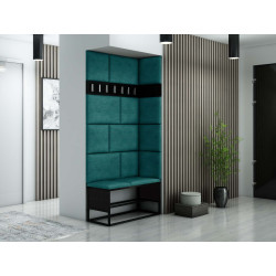Zestaw narożny mebli do przedpokoju Loft P12 to nowoczesne i oryginalne rozwiązanie dla osób, które pragną stworzyć wyjątkową aranżację swojego przedpokoju. Metalowy stelaż szafki na buty w kolorze czarny mat i tapicerowane wysokiej jakości welurową tkaniną panele podkreślają industrialny charakter i zachwycają prostą formą. Wieszak posiada siedem haczyków, a pod siedziskiem zmieścisz do ośmiu par butów! Do zestawu można dokupić dodatkowe panele, tworząc zestaw skrojony na miarę własnych potrzeb. Płyta meblowa wypełniająca boki szafki oraz panele dostępne są w czterech kolorach do wyboru.