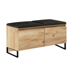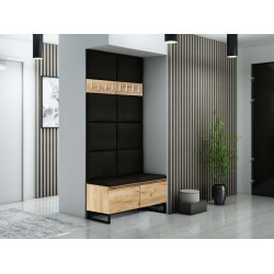 Zestaw mebli do przedpokoju Megan 2PP8 to połączenie nowoczesnego wzornictwa z wygodą i komfortem użytkowania. W skład zestawu wchodzi pojemna szafka na buty z siedziskiem o szerokości 100 cm , dwa wieszaki oraz osiem tapicerowanych paneli. Siedzisko wykonane jest z wysokiej jakości welurowej tkaniny tapicerskiej, a wygodne otwieranie szafki zapewniają siłowniki gazowe. Szafka posiada metalowe nogi o wysokości 12 cm (malowane proszkowo w kolorze czarnym), wzmocnione w tylnej części czarną płytą meblową. Do szafki można dopasować panele ścienne, wieszaki i komody, tworząc własną aranżację przedpokoju.