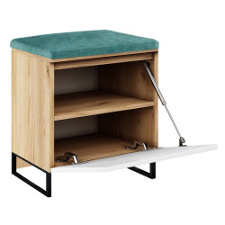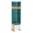 Zestaw mebli do przedpokoju Megan 1PP8 to połączenie nowoczesnego wzornictwa z wygodą i komfortem użytkowania. W skład zestawu wchodzi pojemna szafka na buty z siedziskiem o szerokości 50 cm , wieszak ścienny, osiem paneli tapicerowanych oraz listwa ozdobna. Siedzisko wykonane jest z wysokiej jakości welurowej tkaniny tapicerskiej, a wygodne otwieranie szafki zapewniają siłowniki gazowe. Szafka posiada metalowe nogi o wysokości 12 cm (malowane proszkowo w kolorze czarnym), wzmocnione w tylnej części czarną płytą meblową. Do szafki można dopasować panele ścienne, wieszaki i komody, tworząc własną aranżację przedpokoju.