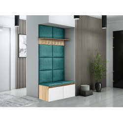 Zestaw mebli do przedpokoju Megan 2P8W to połączenie nowoczesnego wzornictwa z wygodą i komfortem użytkowania. W skład zestawu wchodzi pojemna szafka na buty z siedziskiem Megan 2 o szerokości 100 cm (wygodne otwieranie szafki zapewniają siłowniki gazowe), dwa wieszaki ścienne z półką oraz osiem tapicerowanych paneli ściennych. Zarówno panele , jak i siedzisko wykonane są w przyjemnej w dotyku, wysokiej jakości tkaniny. W miarę potrzeb zestaw można rozbudować o dodatkowe szafki, komody i panele.