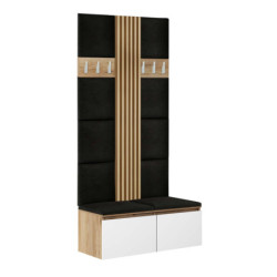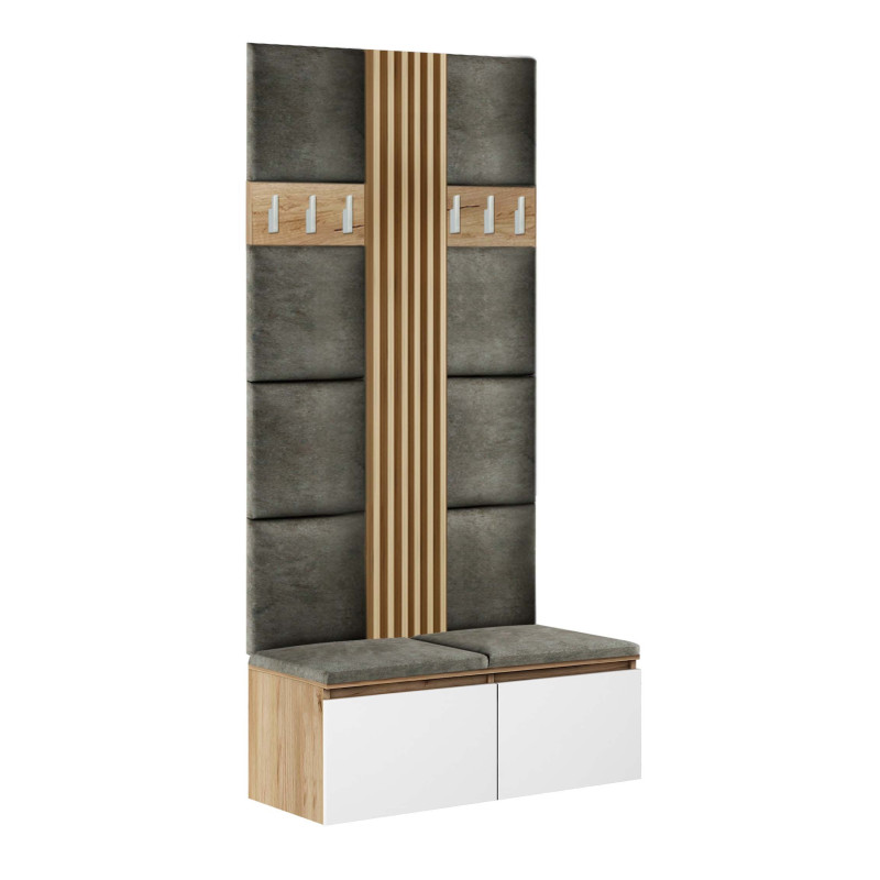 Zestaw mebli do przedpokoju Megan 2P8ML z panelem lamelowym bez wątpienia wpisuje się w najmodniejszy obecnie trend wyposażenia wnętrz . W skład zestawu wchodzi pojemna szafka na buty z siedziskiem Megan 2 o szerokości 100 cm (wygodne otwieranie szafki zapewniają siłowniki gazowe), dwa wieszaki ścienne, osiem tapicerowanych paneli ściennych oraz lamel ścienny ( w dwóch częściach łączonych na wysokości dwóch paneli, o łącznej wysokości 164 cm). Zarówno panele , jak i siedzisko wykonane są w przyjemnej w dotyku, wysokiej jakości tkaniny. W miarę potrzeb zestaw można rozbudować o dodatkowe szafki, komody i panele.