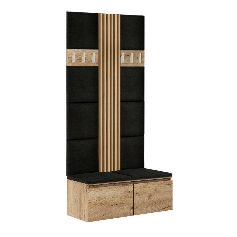 Zestaw mebli do przedpokoju Megan 2P8ML z panelem lamelowym bez wątpienia wpisuje się w najmodniejszy obecnie trend wyposażenia wnętrz . W skład zestawu wchodzi pojemna szafka na buty z siedziskiem Megan 2 o szerokości 100 cm (wygodne otwieranie szafki zapewniają siłowniki gazowe), dwa wieszaki ścienne, osiem tapicerowanych paneli ściennych oraz lamel ścienny ( w dwóch częściach łączonych na wysokości dwóch paneli, o łącznej wysokości 164 cm). Zarówno panele , jak i siedzisko wykonane są w przyjemnej w dotyku, wysokiej jakości tkaniny. W miarę potrzeb zestaw można rozbudować o dodatkowe szafki, komody i panele.