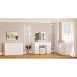 Komoda Megan K3 jest jednym z elementów mebli systemowych Megan, w którym oferujemy również biurka oraz toaletki z oświetleniem led. System charakteryzuje się nowoczesnym wzornictwem bez uchwytów.