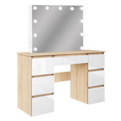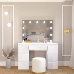 Toaletka Megan B3 z lustrem z żarówkami LED, to idealna propozycja dla każdej kobiety! Siedem praktycznych szufladek pomieści nie tylko wszystkie kosmetyki ale również biżuterię czy perfumy. Dzięki lakierowanym frontom wnętrze nabierze blasku i elegancji. Nowoczesna toaletka z oświetleniem z żarówkami led, to nie tylko idealne miejsce do wykonania perfekcyjnego makijażu, lecz również kącik w którym wygodnie i komfortowo zadbasz o swoją fryzurę! Żarówki ledowe o neutralnej barwie światła są odpowiednio dobrane do wykonywania makijażu. Duża powierzchnia lustra dzięki nowoczesnemu montażowi żarówek bezpośrednio na tafli. W ramie lustra umieszczony jest niewielki włącznik oraz dodatkowe gniazdko do podłączenia suszarki do włosów czy prostownicy. Nie zwlekaj, stwórz swój własny kącik do makijażu i ciesz się komfortem!
