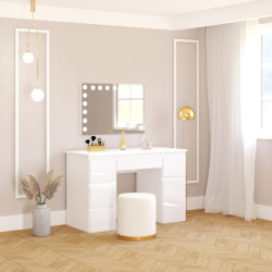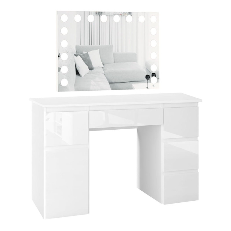 Toaletka Megan B2 z lustrem VISAGE, to idealna propozycja dla każdej kobiety! Pojemna szafka i pięć praktycznych szufladek pomieszczą nie tylko wszystkie kosmetyki ale również biżuterię czy perfumy. Dzięki lakierowanym frontom wnętrze nabierze blasku i elegancji. W komfortowych warunkach zadbasz o swoją urodę. Dzięki wbudowanemu w lustrze oświetleniu Super Led, światło rozkłada się równomiernie, co zapewnia perfekcyjne oświetlenie twarzy podczas wykonywania makijażu. Aluminiowa rama lustra nadaje toaletce elegancji i szyku. Dotykowy włącznik posiada funkcję regulacji jasności światła. Nie zwlekaj, stwórz swój własny kącik do makijażu i ciesz się komfortem!