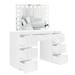 Toaletka Megan B3 z lustrem VISAGE, to idealna propozycja dla każdej kobiety! Siedem praktycznych szufladek pomieści nie tylko wszystkie kosmetyki ale również biżuterię czy perfumy. Dzięki lakierowanym frontom wnętrze nabierze blasku i elegancji. W komfortowych warunkach zadbasz o swoją urodę. Dzięki wbudowanemu w lustrze oświetleniu Super Led, światło rozkłada się równomiernie, co zapewnia perfekcyjne oświetlenie twarzy podczas wykonywania makijażu. Aluminiowa rama lustra nadaje toaletce elegancji i szyku. Dotykowy włącznik posiada funkcję regulacji jasności światła. Nie zwlekaj, stwórz swój własny kącik do makijażu i ciesz się komfortem!