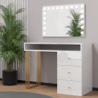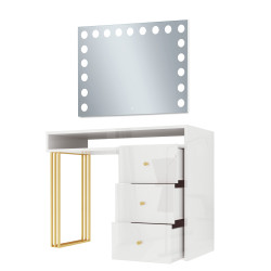 Toaletka Klara Visage na metalowych nogach. Wykonana jest z płyty akrylowej 18mm w kolorze biały połysk. Złote nogi i uchwyty pięknie podkreślają kolor mebla. Doskonale pasuje do wnętrz nowoczesnych, w stylu glamour i art deco. Toaletka z trzema szufladami i otwartym schowkiem pod blatem zapewni wiele miejsca do przechowywania. Dzięki wbudowanemu w lustrze oświetleniu Super Led, światło rozkłada się równomiernie, co zapewnia perfekcyjne oświetlenie twarzy podczas wykonywania makijażu. Aluminiowa rama lustra nadaje toaletce elegancji i szyku. Dotykowy włącznik posiada funkcję regulacji jasności światła.