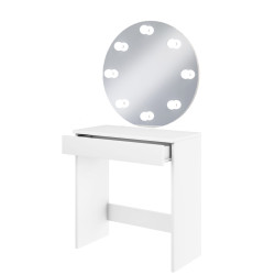 Toaletka Megan z okrągłym pełnym lustrem to funkcjonalny i niezbędny mebel dla każdej kobiety. Idealne miejsce do wykonania makijażu, ale też kącik w którym zadbasz o swoją fryzurę. 8 żarówek typu LED perfekcyjnie oświetli twarz. Toaletka sprawdzi się w domu jako mebel codziennego użytku dla każdej kobiety, ale również w salonie urody jako miejsce do pracy makijażystki.