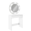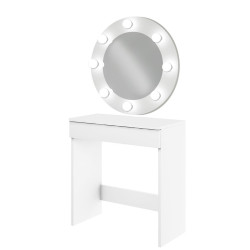 Toaletka Megan z okrągłym białym lustrem to funkcjonalny i niezbędny mebel dla każdej kobiety. Idealne miejsce do wykonania makijażu, ale też kącik w którym zadbasz o swoją fryzurę. 8 żarówek typu LED perfekcyjnie oświetli twarz. Toaletka sprawdzi się w domu jako mebel codziennego użytku dla każdej kobiety, ale również w salonie urody jako miejsce do pracy makijażystki.