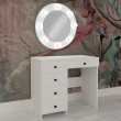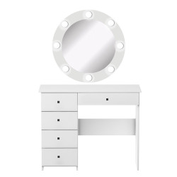 Toaletka V z okrągłym białym lustrem to funkcjonalny i niezbędny mebel dla każdej kobiety. Idealne miejsce do wykonania makijażu, ale też kącik w którym zadbasz o swoją fryzurę. 8 żarówek typu LED perfekcyjnie oświetli twarz. Toaletka sprawdzi się w domu jako mebel codziennego użytku dla każdej kobiety, ale również w salonie urody jako miejsce do pracy makijażystki.